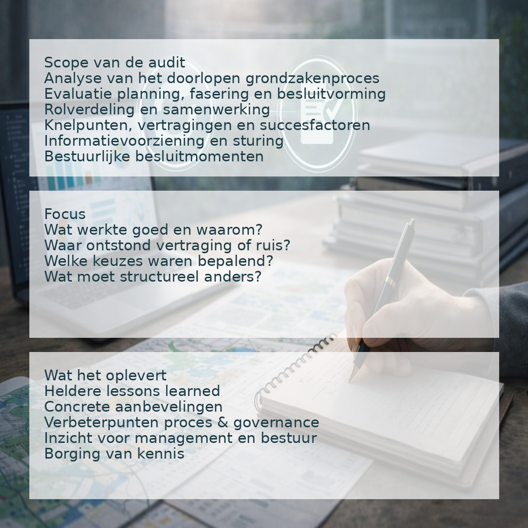 RealFlow Consultancy voert onafhankelijke projectevaluaties en audits uit op afgeronde grondzakenprojecten, met als doel: leren, verbeteren en professionaliseren — niet corrigeren of repareren.